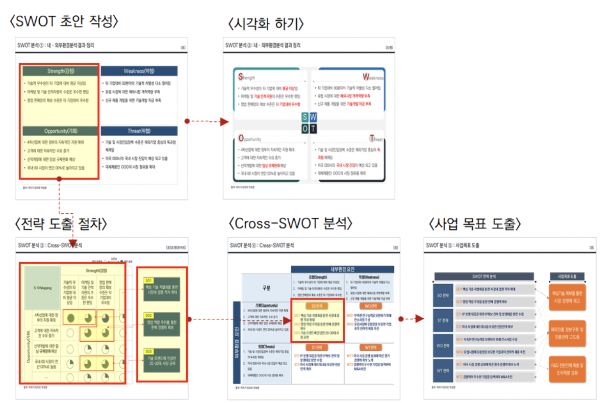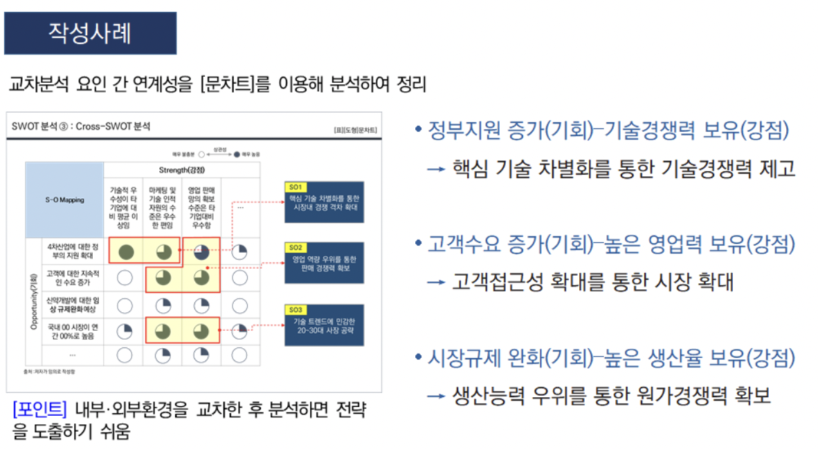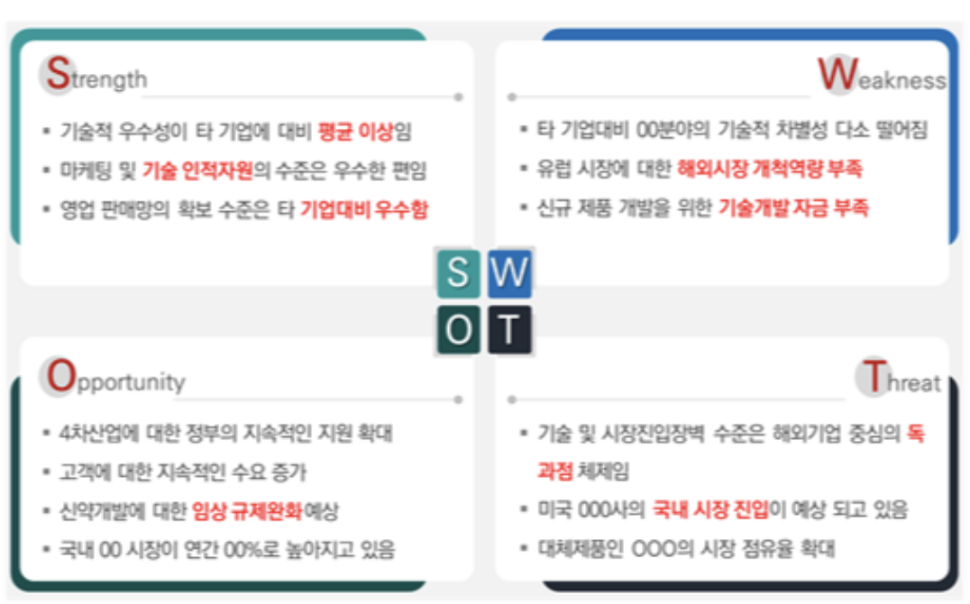 - 정부 지원 확대(기회) - 기술 경쟁력 좋음(강점) : 핵심 기술 차별화를 통해 기술경쟁력 강화