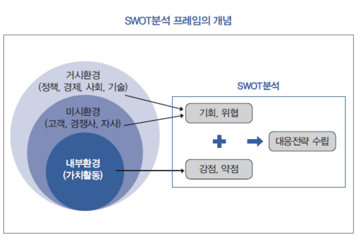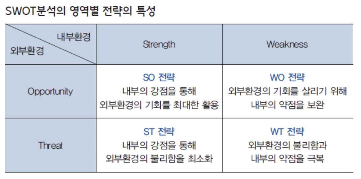 SWOT 분석을 통해 내부 + 외부 환경 분석을 하여 대응전략을 수립하는 것이 큰 목표이다.