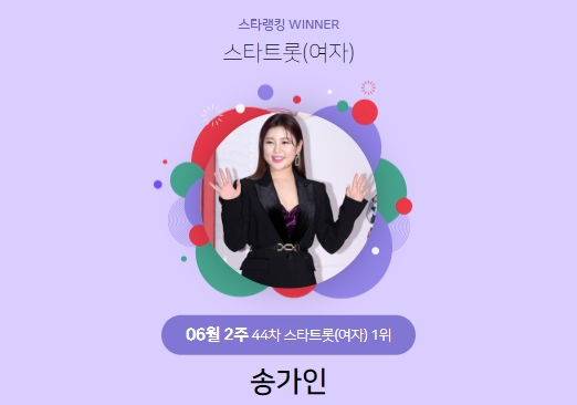 송가인은 6월 9일 오후 3시 1분부터 16일 오후 3시까지 진행된 스타랭킹 여자 트롯스타 부문 44차(6월 2주차) 투표에서 6만 2259표로 1위를 차지했습니다.