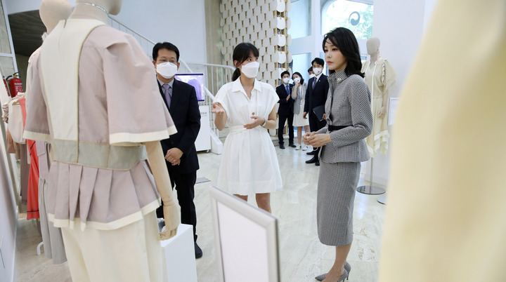 김 여사는 특히 인견으로 만든 작품을 관심 있게 관찰하며 "한국 의류 소재의 가치가 남다르다"고 말했다. 또 "대한민국의 문화는 크리에티브하게 확장 가능하다"고 강조했습니다.