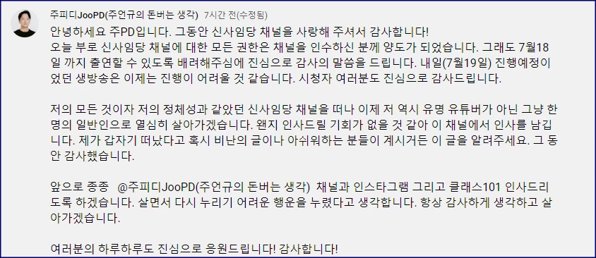 19일 신사임당의 주PD는 공식 SNS에 "그동안 신사임당 채널을 사랑해주셔서 감사하다.