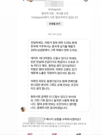 그러면서 “데이트 1회 5억 정도 드릴 수 있다고 하세요. 돈은 만날 때 선금이구요. 현금이나 수표로 가능하다.