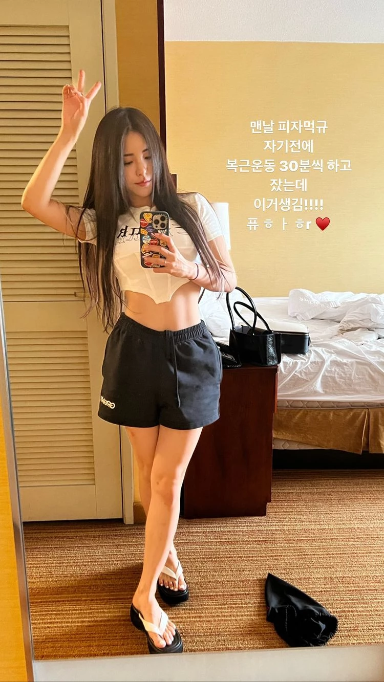 유정은 17일 자신의 인스타그램 스토리에 "맨날 피자 먹고 자기 전에 복근 운동 30분씩 하고 잤는데 이거 생김. 푸하하"라는 글과 함께 한 장의 사진을 게재했다.