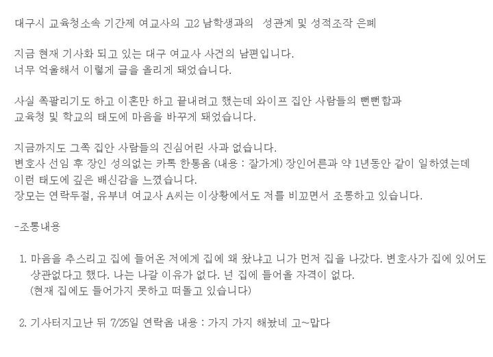 논란이 거세지자 지난 25일 온라인 커뮤니티에는 '대구 여교사 성관계 및 성적 조작 은폐 남편입니다'라는 글이 올라왔다.