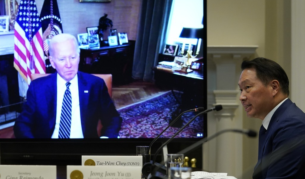 26일(현지시각) 최태원 SK 회장 등 SK그룹 경영진은 미국 백악관에서 조 바이든 대통령 등과 면담했다.