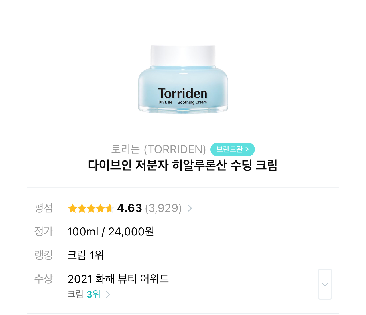 4. 다이브인 저분자 히알루론산 수딩 크림