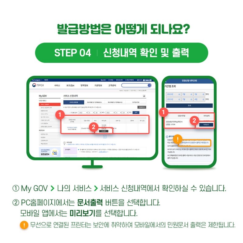 ※ 무선으로 연결된 프린터는 보안에 취약하여 모바일에서의 민원문서 출력은 제한됩니다.