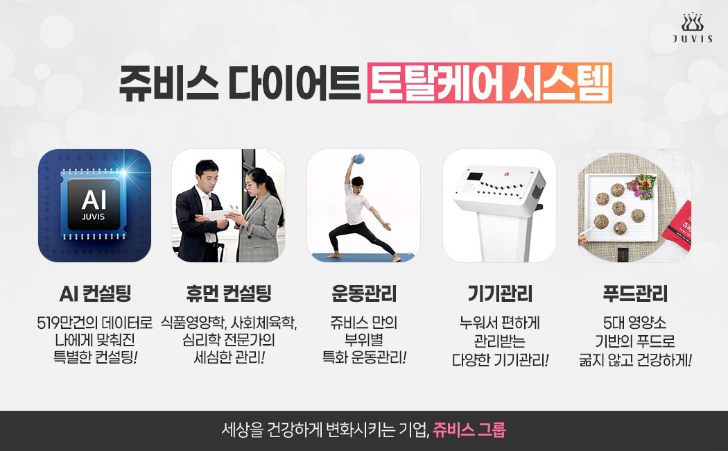 쥬비스 프리미엄 간편 푸드, 쥬비스 몰, 쥬비스 온라인 강의, 쥬비스 비만 연구소로 구성된