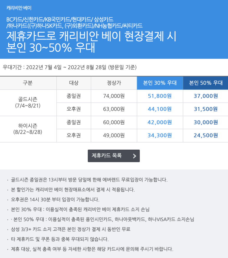 - 제휴카드로 캐리비안 베이 현장결제 시 본인 30~50% 우대