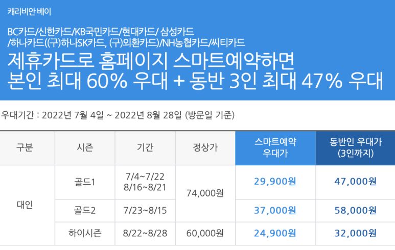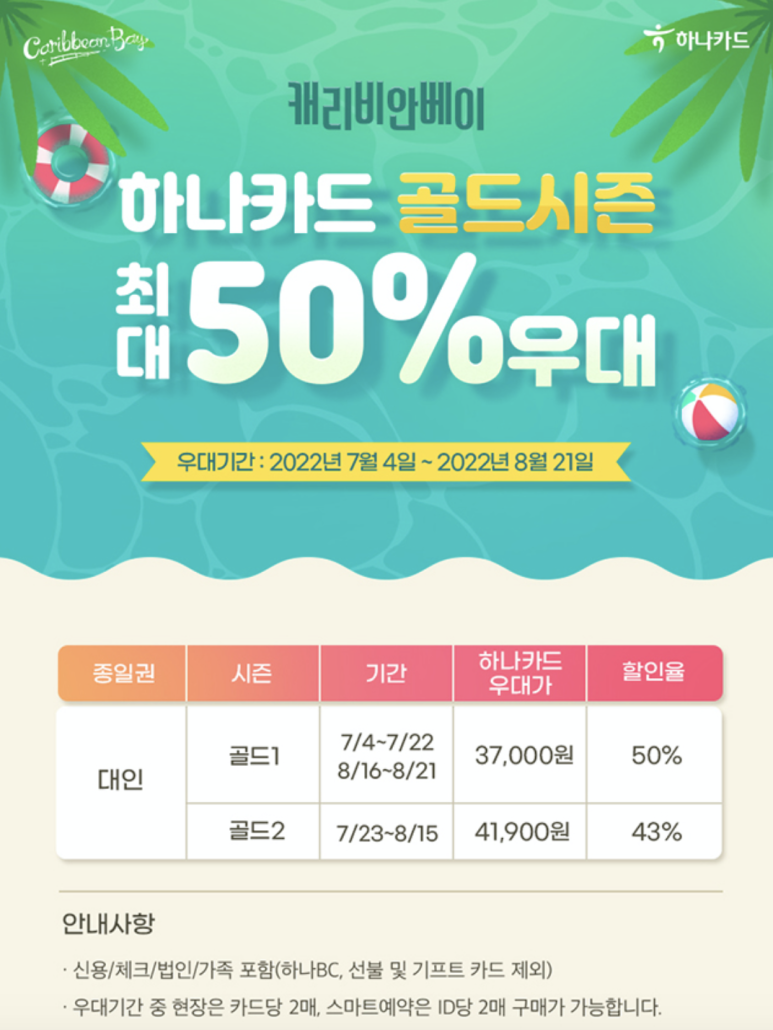 캐리비안 베이 제휴카드 스마트예약 추가 우대 (7월~8월)
