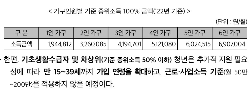 - 신청 후 소득조사 결과 기준 중위소득 50%를 초과했을 때에는 연령기준(만19세~34세)