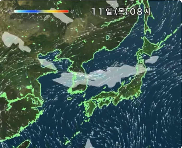 현재 중국북부에서 동해상까지,  마치 초여름 장마전선처럼 긴 띠를 이룬 비구름대가 늘어서 있습니다.