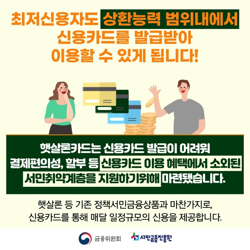 햇살론카드는 신용카드 발급이 어려워 결제편의성, 할부 등 신용카드 이용 혜택에서 소외된 서민취약계층을 지원하기위해 마련되었으며, 최저신용자도 상환능력 범위내에서 신용카드를 발급받아 이용할 수 있습니다.