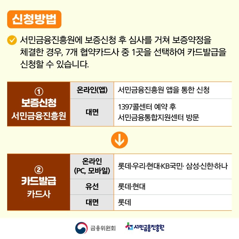 서민금융진흥원에 보증신청 후 심사를 거쳐 보증약정을 체결한 경우, 7개 협약카드사 중 1곳을 선택하여 카드발급 신청