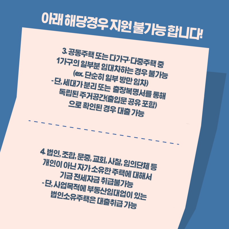 또한, 담보 취득이 불가능한 주택의 경우(보증서 발급 거절 등) 전세자금대출 지원이 불가합니다.