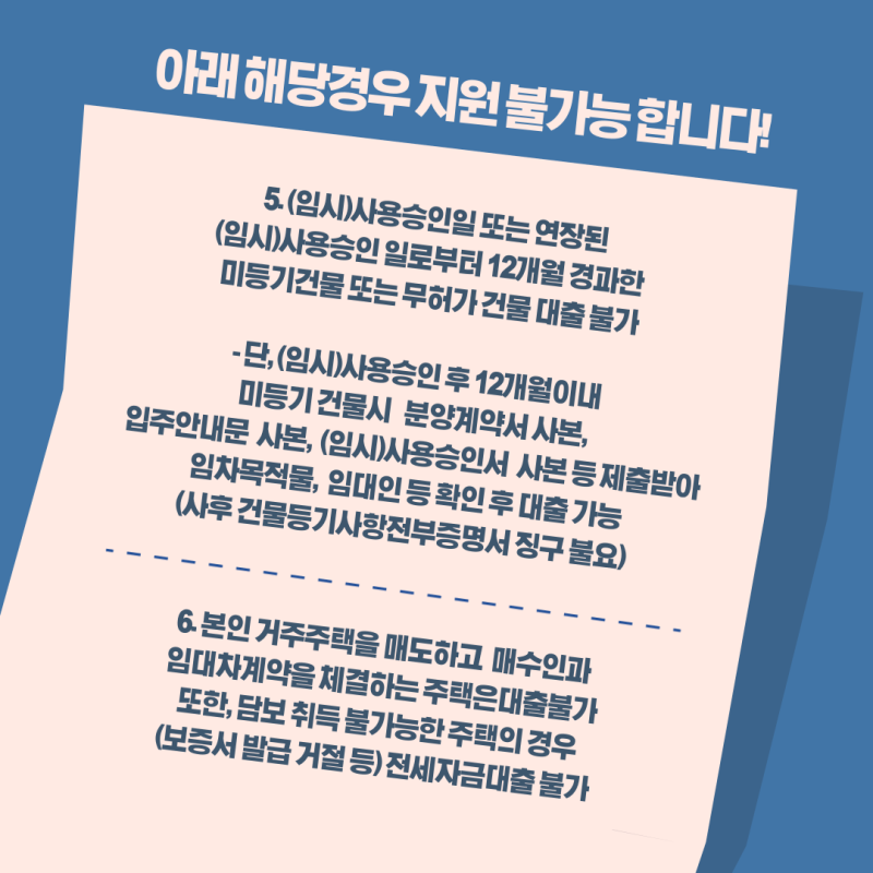 또한, 담보 취득이 불가능한 주택의 경우(보증서 발급 거절 등) 전세자금대출  지원이 불가합니다.