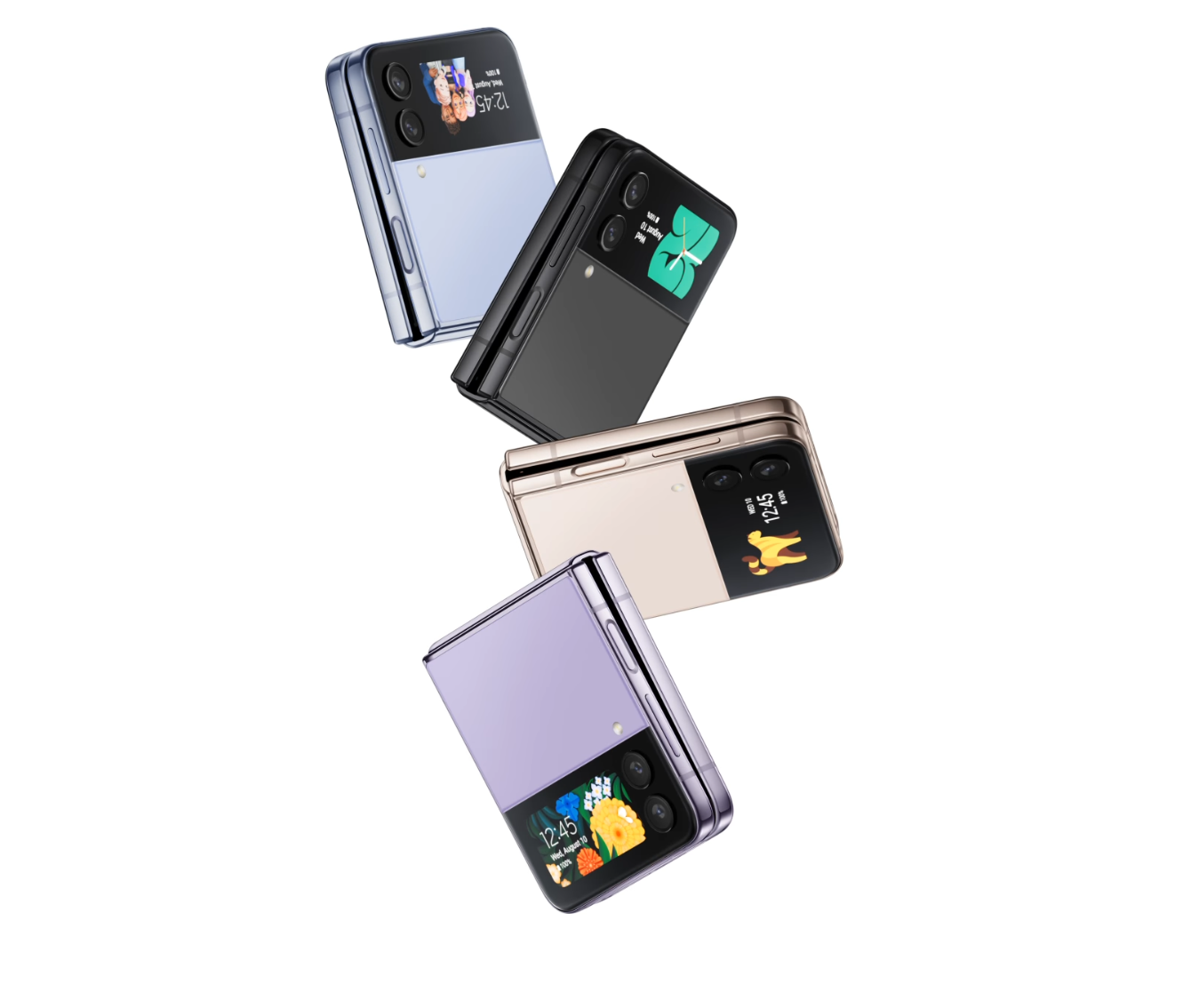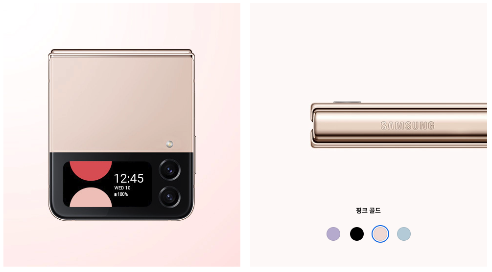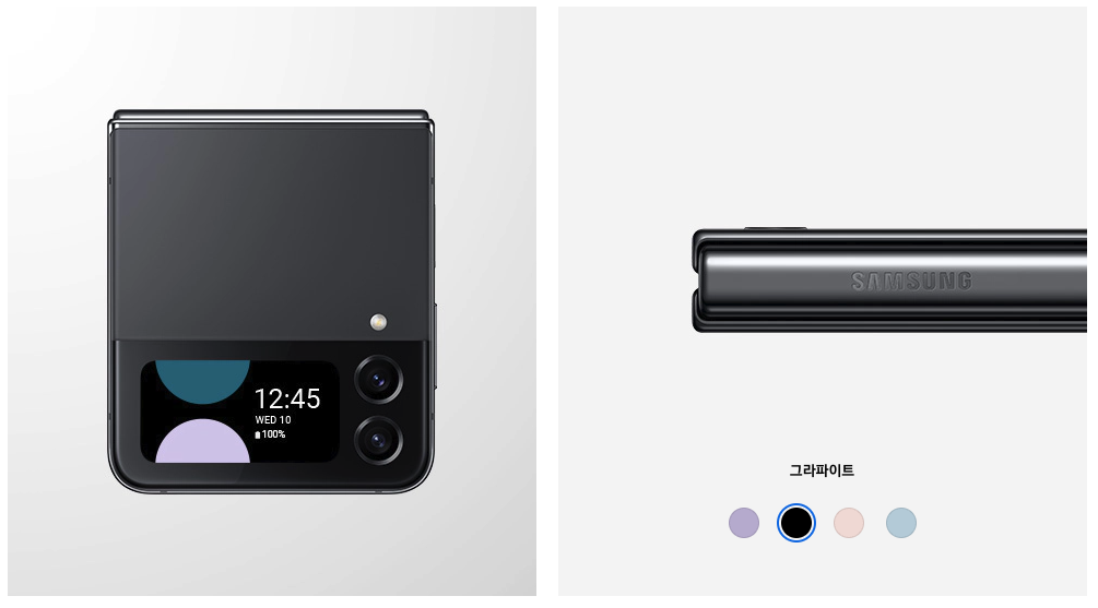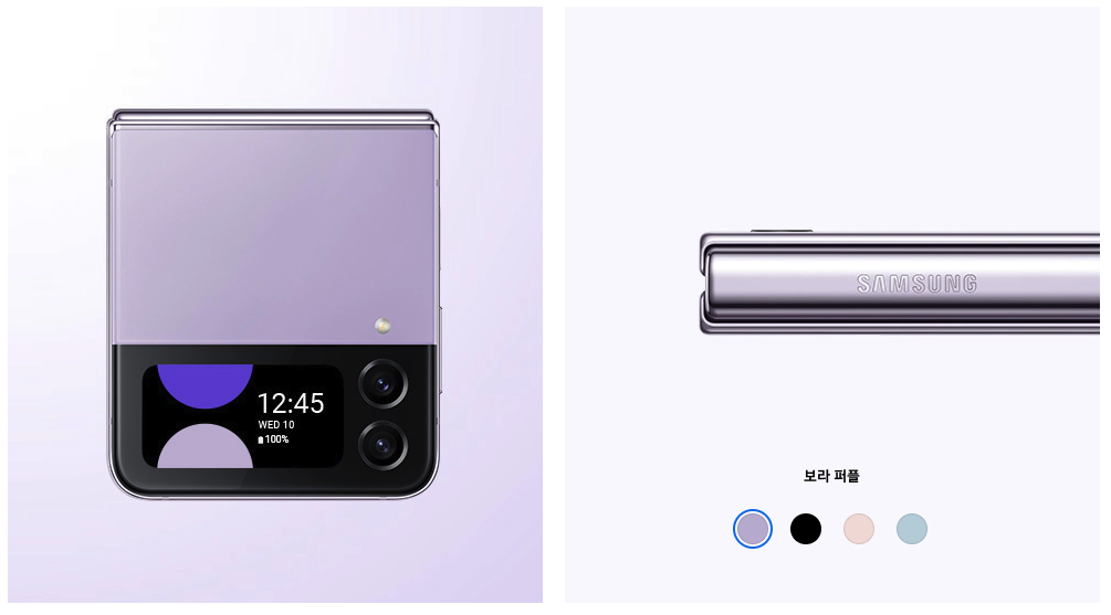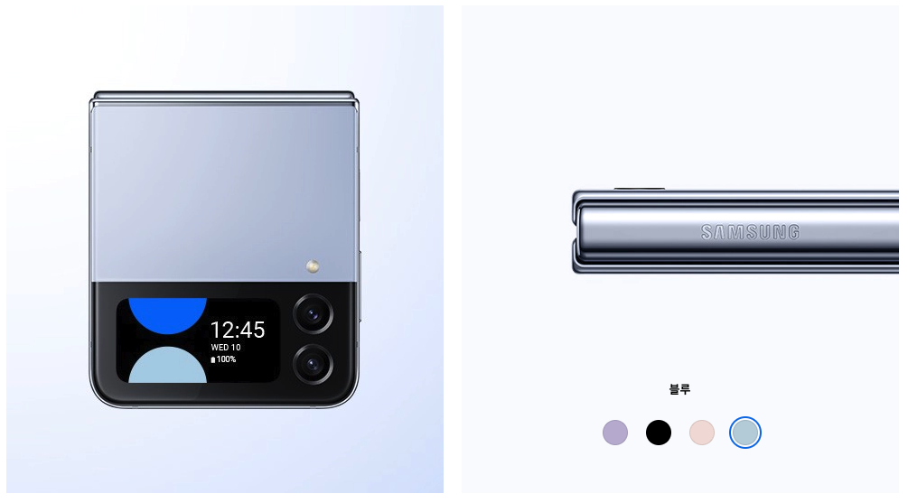 색상은 갤럭시Z플립4의 경우 보라 퍼플과 그라파이트, 핑크 골드, 블루 등 네 가지로 구성되었고