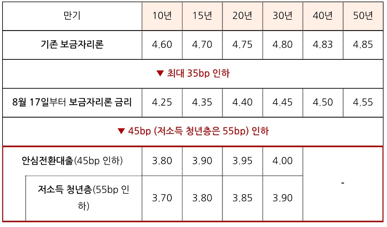 3.80 ~ 4.00% 보금자리론 금리 대비 45bp 인하
