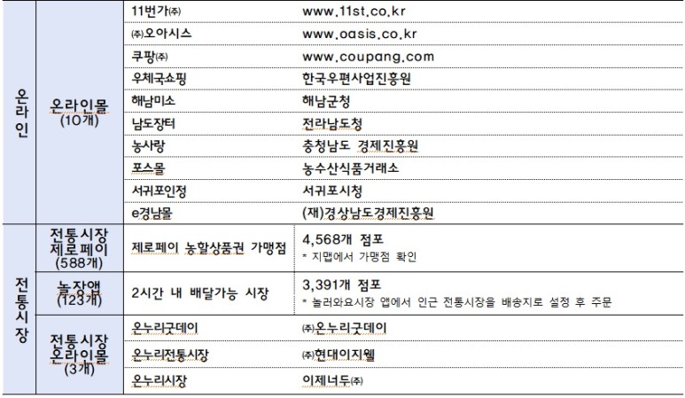 마트, 온라인몰, 직매장, 전통시장 등에서