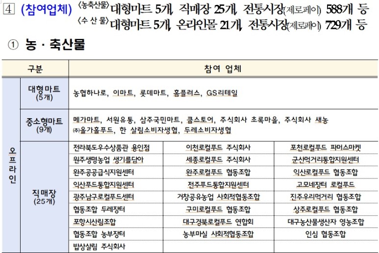 직매장, 온라인몰, 전통시장 등 다양한 업체가 참여합니다.