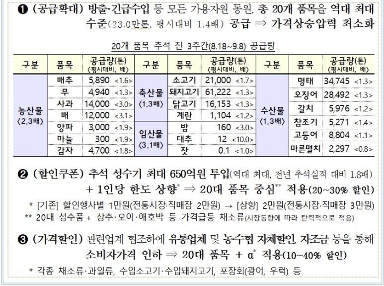 20개 품목 공급량을 역대 최대 수준으로 올린다고 합니다.