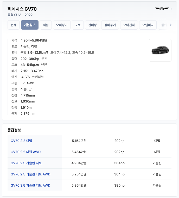 GV70의 기본 가격은 4,904만원입니다. 옵션을 추가하면 가격이 상승합니다. 3.5T 풀옵션 모델은 최대 7,736만원까지 올라갈 수 있습니다. 가장 많이 팔리는 가격대는 5천만 원 후반에서 6천만 원 초반 사이로, 보통 2.5T 기본 트림에 일부 옵션이 포함되어 있습니다.