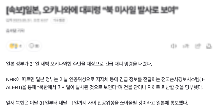 이유는 북한에서 남측 방향으로 우주발사체 (미사일) 을 발사하였는데요