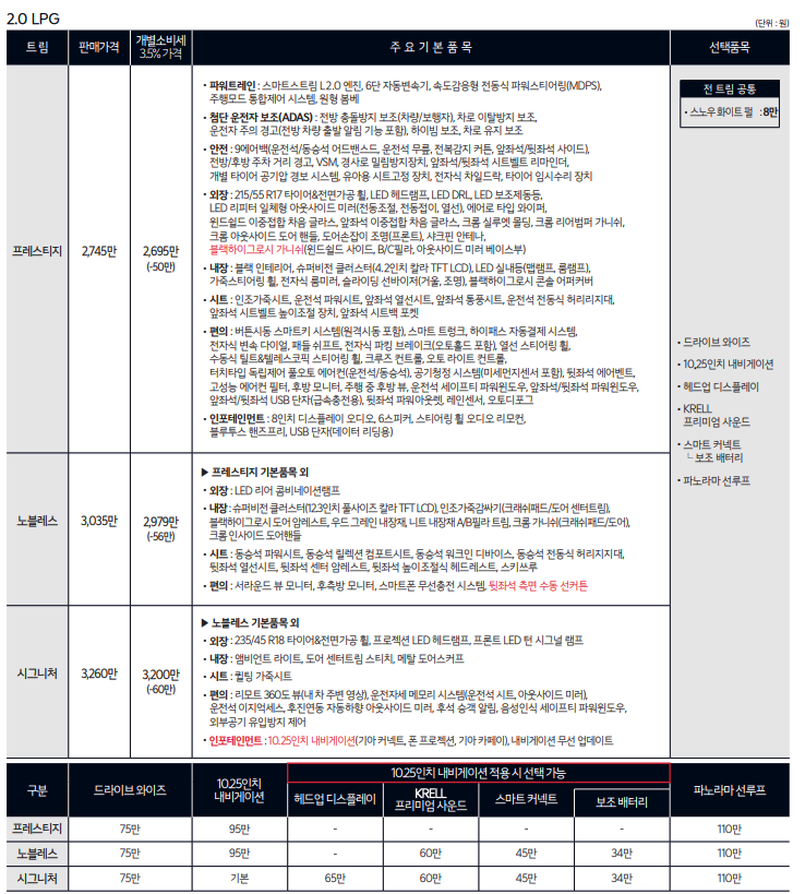 Kia K5는 다양한 트림과 선택적인 추가 기능을 제공하여 다양한 고객의 요구를 충족시킵니다. 가격 범위는 모델과 추가 기능에 따라 24,000,000원에서 32,840,000원까지 다양합니다. K5는 가솔린과 LPG 연료 옵션을 제공하며, 엔진 출력은 146hp에서 180hp까지 다양합니다.