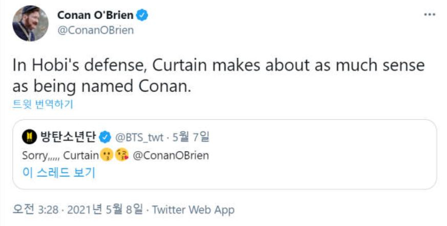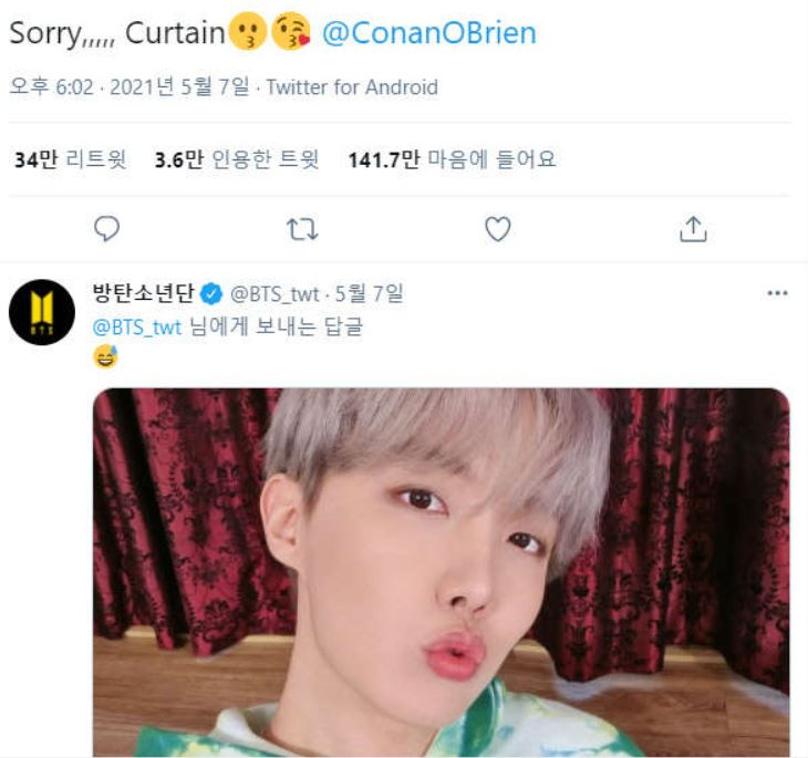 Conan quoted J-Hope's tweet on the 8th and said, "To defend Hobi, curtains mean as much as Conan."