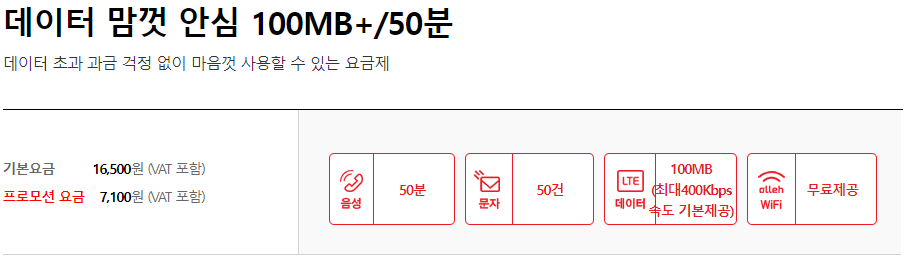 통화 50분 / 문자 50건 / 데이터 100MB+400kbps 무제한으로