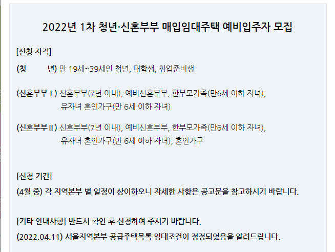 LH공사의 2022년 1차 청년, 신혼부부 매입임대주택 예비 입주자 모집이 시작되었습니다.