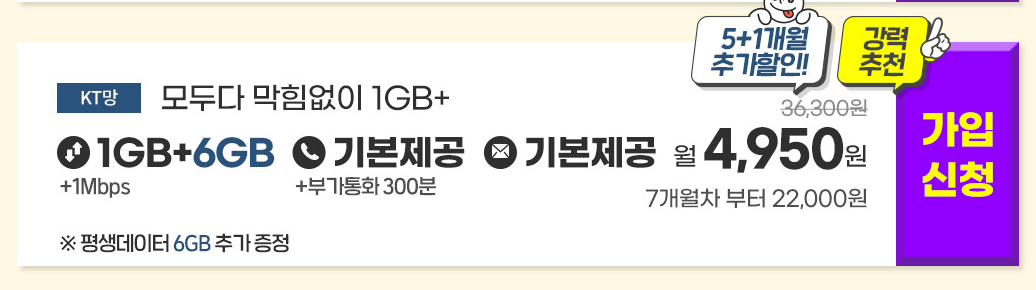 게다가 지금 가입하면 데이터를 평생 매월 6GB씩 추가 증정하여 데이터를 매월 7GB를 쓰고 속도제한무제한으로 쓰면 되네요