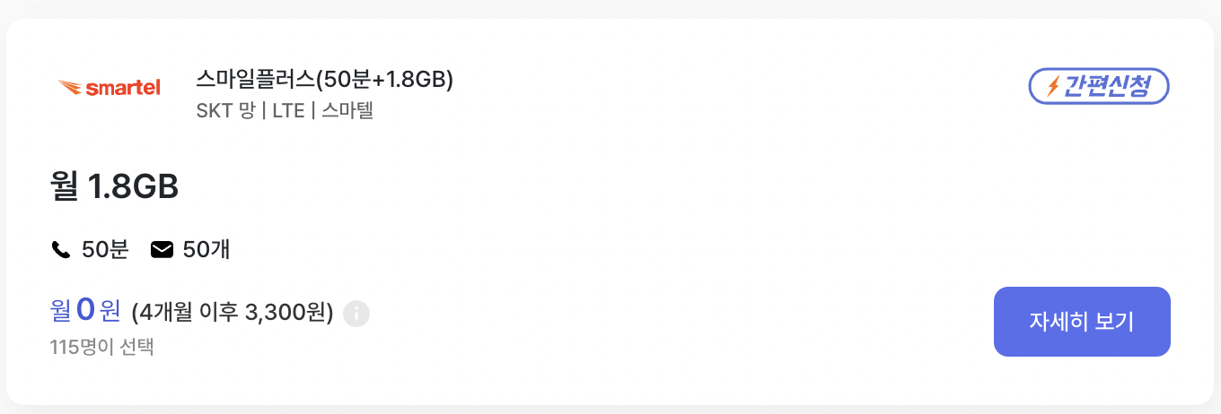 이 요금제의 기본제공량은 통화 50분 / 문자 50건 / 데이터 1.8GB
